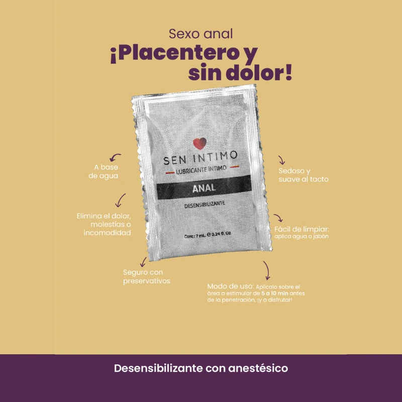 El Lubricante Anal Sachet Sen Intimo es una opción práctica y eficaz para explorar el placer anal con comodidad y sin molestias. Su fórmula desensibilizante ayuda a relajar la zona, disminuyendo la sensibilidad inicial para lograr una experiencia más suave, progresiva y placentera.