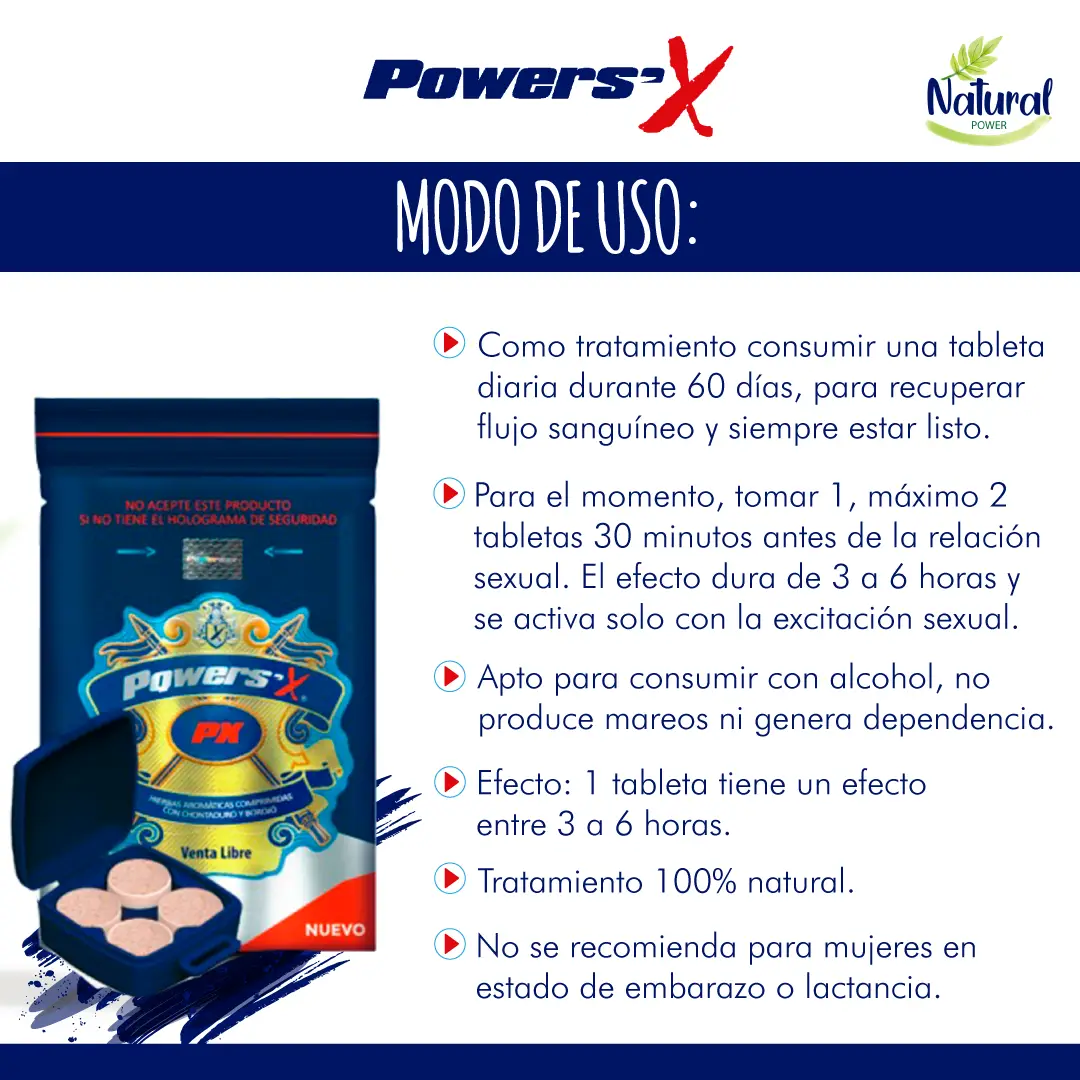 PowerS`X es una fantástica alternativa para mejorar la potencia sexual, sus componentes son a base de extractos de frutos, plantas y aminoácidos.